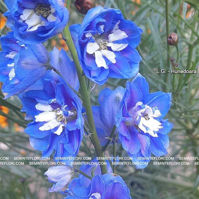 Florile sunt duble si semi-duble in nuante de alb, purpuriu si albastru.